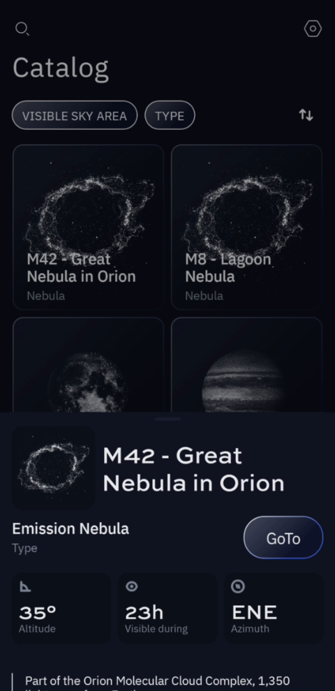 Wenn das ausgewählte Objekt in dem von Ihnen eingestellten sichtbaren Himmelsbereich sichtbar ist, können Sie auf die Schaltfläche Go-to tippen. Das Teleskop schwenkt dann automatisch zum Zielobjekt.