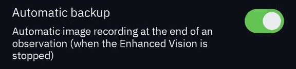 In den Einstellungen der Beobachtungsseite können Sie die automatische Sicherung aktivieren, die automatisch eine Aufnahme speichert, wenn die Enhanced Vision (Dynamic Signal Amplification) angehalten wird.