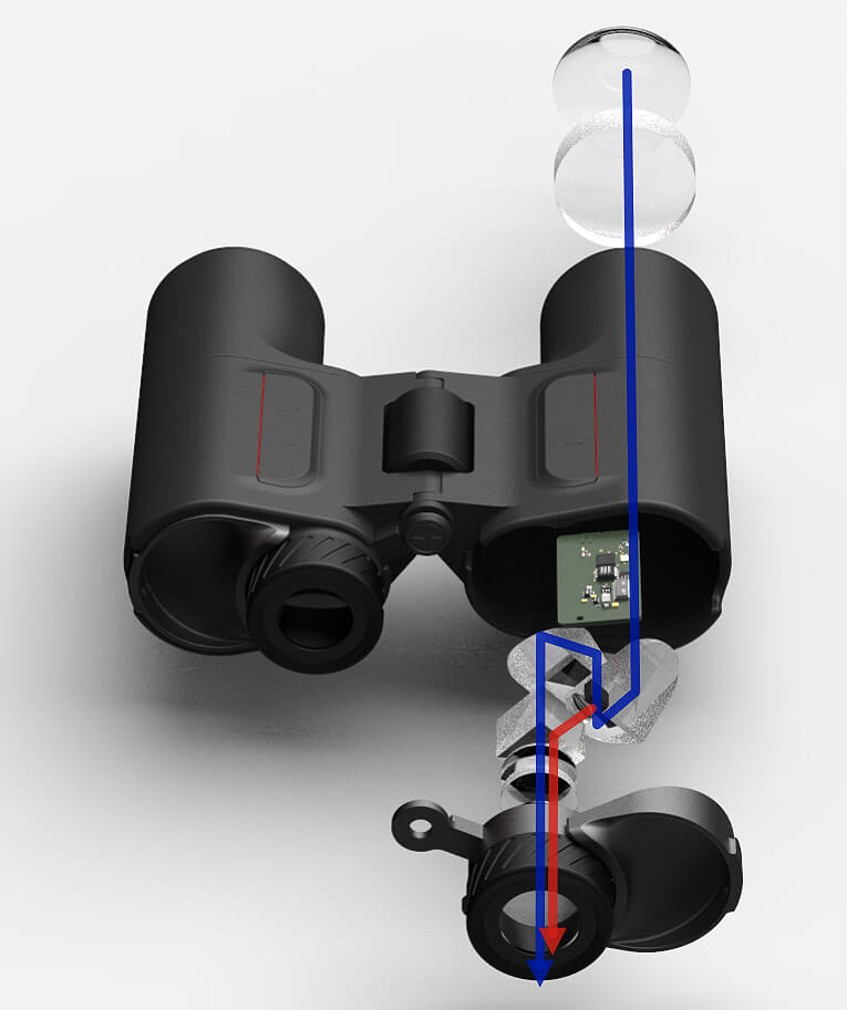 • AR-Projektion: Die rechte Seite des Fernglases ist mit einem hochentwickelten Augmented-Reality-Projektionssystem ausgestattet. Dieses System projiziert kontextbezogene Informationen auf den optischen Pfad, um die AR-Daten mit der realen Ansicht zu überlagern.