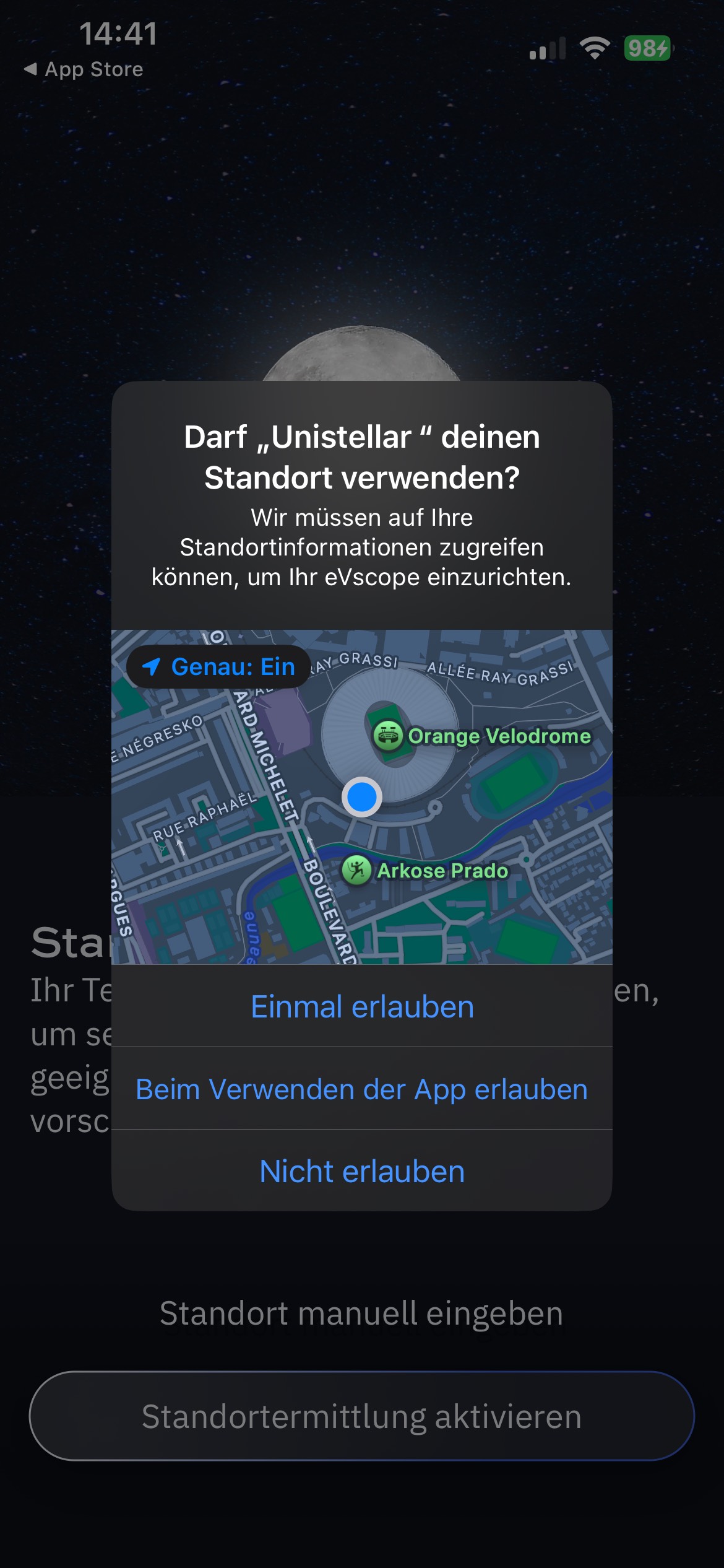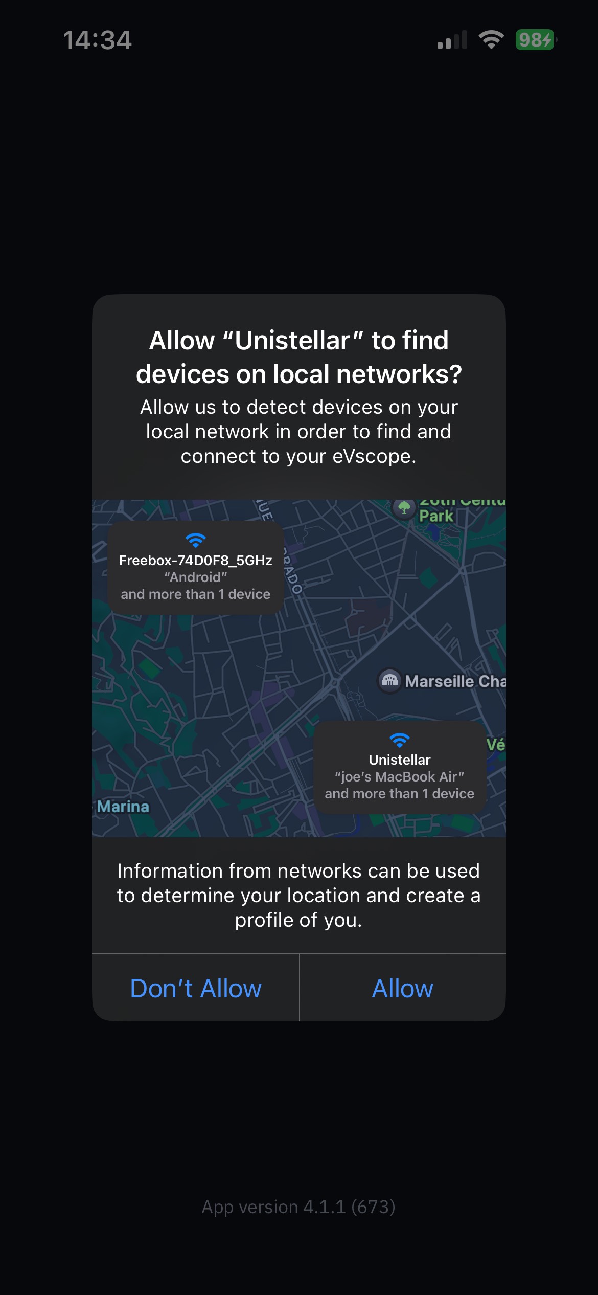 – Wenn die Meldung „UNISTELLAR möchte Geräte in Ihrem lokalen Netzwerk finden und verbinden“ angezeigt wird, tippen Sie OK