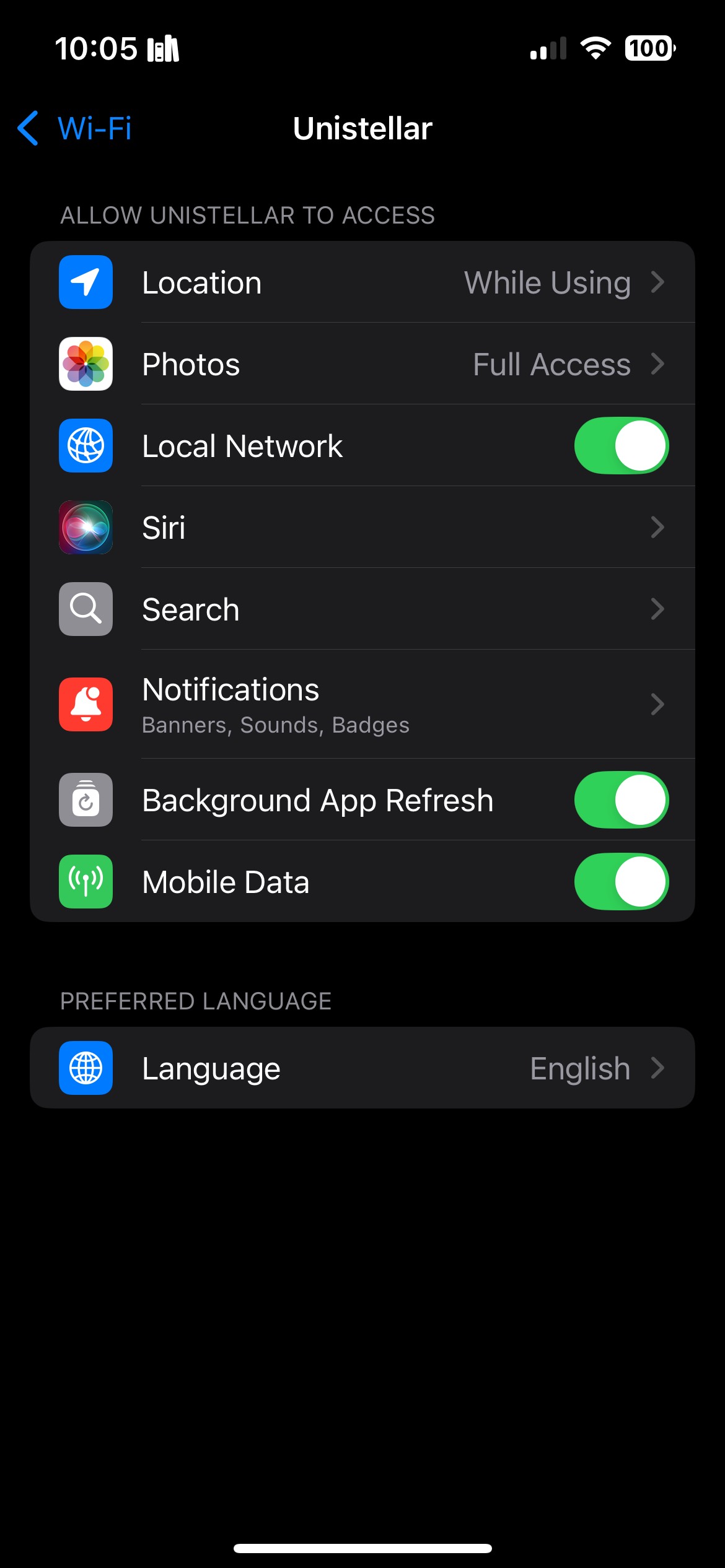 If you mistakenly select another setting, you can adjust it by going to your device settings, scrolling to the list of apps, tapping on the Unistellar app, and changing the desired option, as shown below.