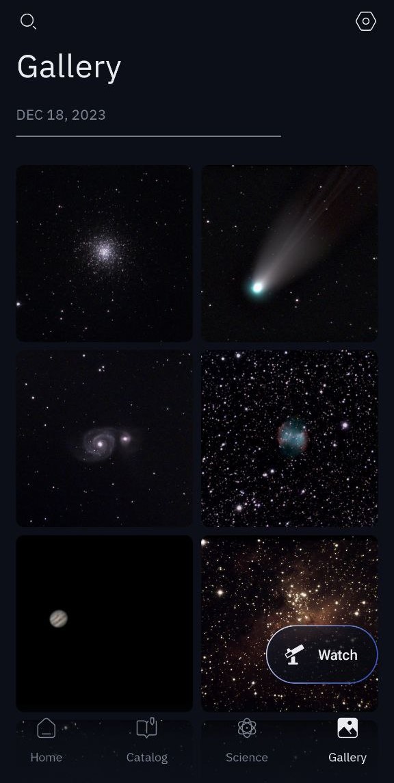 La galerie est l'endroit où vous trouverez toutes les images que vous avez sauvegardées au cours de vos sessions d'observation. À partir de la galerie, vous pouvez afficher des informations détaillées sur vos images, les partager avec vos amis et les supprimer.