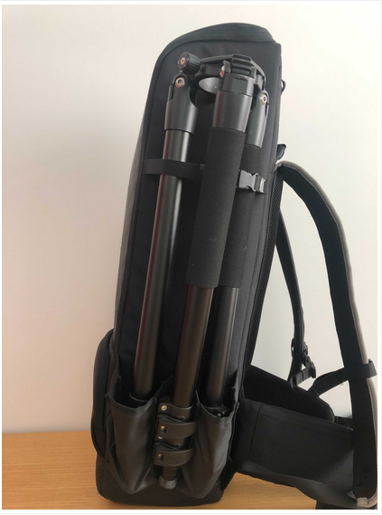 Le trépied doit être placé sur le côté du sac à dos (sinon il rayera le tube, ce que nous voulons éviter). Assurez-vous que deux des trois jambes du trépied sont placées dans les poches latérales prévues à cet effet et qu'elles sont solidement attachées à l'aide de la sangle extérieure, comme indiqué ci-dessous :