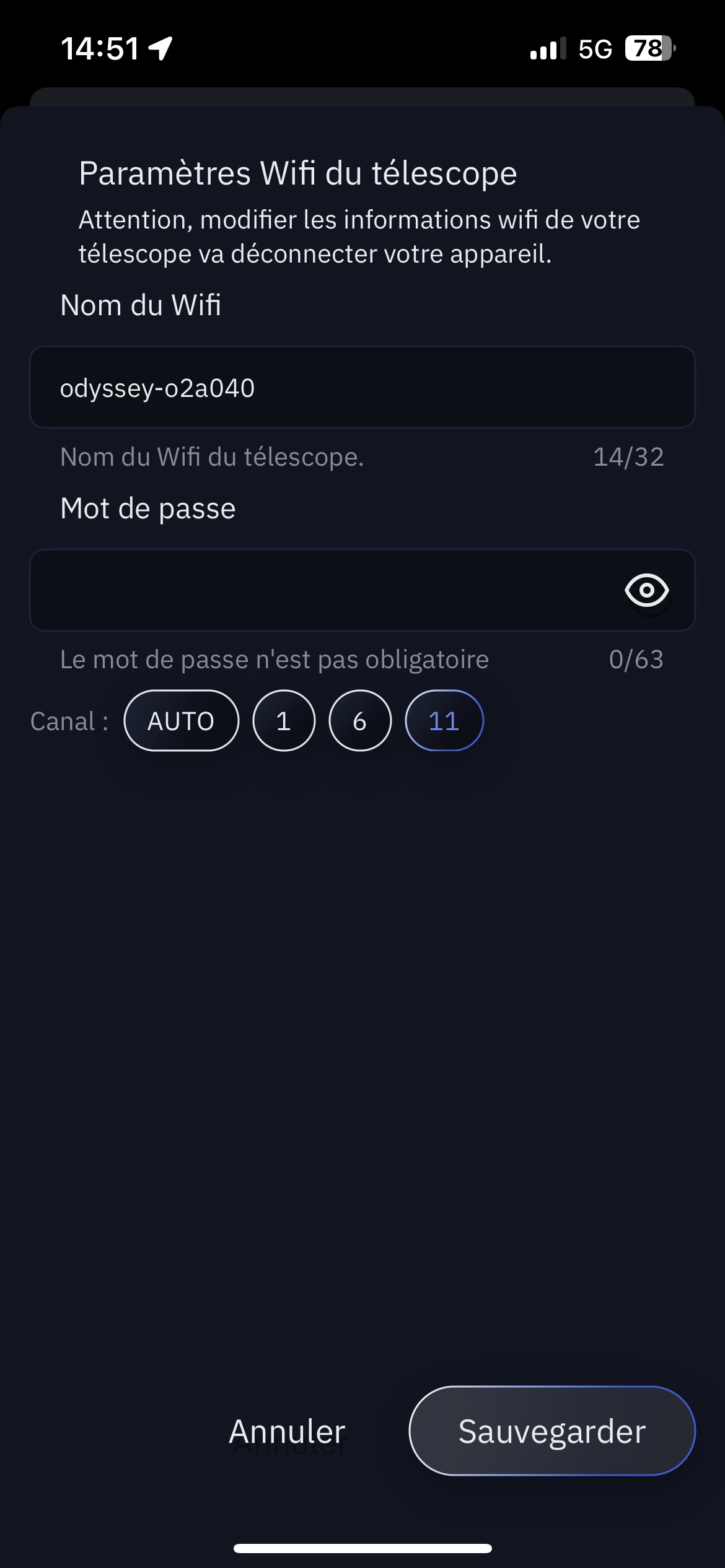Puis Paramètres Wifi du télescope. Créez votre mot de passe dans le champ dédié au mot de passe et enregistrez-le. Le nombre de caractères doit être compris entre 8 et 63. Une fois le mot de passe enregistré, il n'est plus affiché.