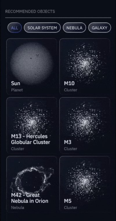 ホーム画面にはおすすめの天体が表示されます。上部のボタンで種類を絞り込み、