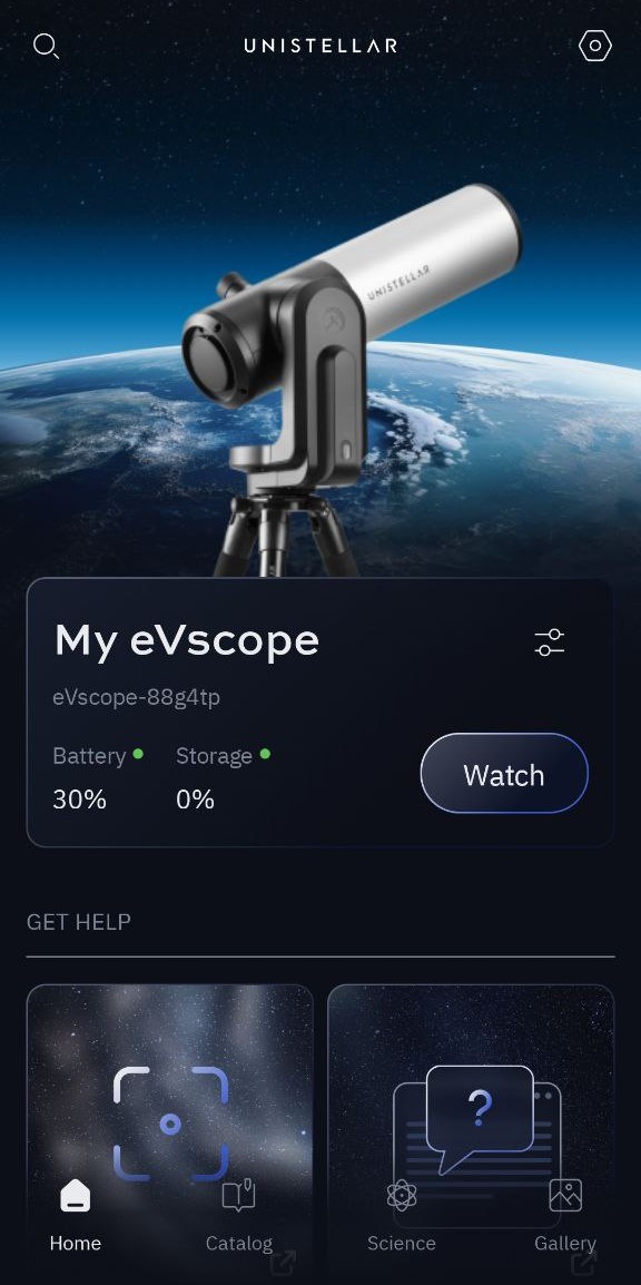 注意:古いバージョンのアプリケーションを使用している場合、ホームページにアクセスするためにアプリケーションとファームウェアをアップデートする必要があります(UNISTELLARアプリをアップデートするには?)