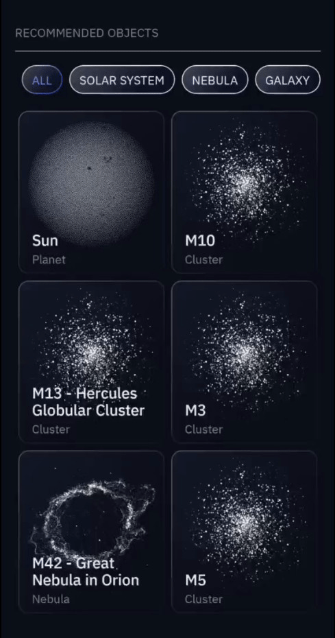 設定ボタンをタップすると、 望遠鏡の設定に直接アクセスできます。見る」ボタンをタップすると、観測ページに移動し、観測を開始します。