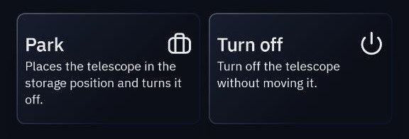 観測セッションが終了したら、望遠鏡をパーク(格納位置に戻す)して電源をオフにしたい場合があります。これは望遠鏡の設定メニューから行うことができます。